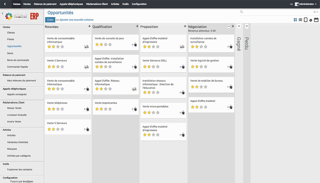 INSIDJAM CRM est un module de gestion de la relation client qui a pour fonction principale de compiler les informations client collectées à partir des points de contact entre l’entreprise et le client (site de l’entreprise, réseaux sociaux, chat, e-mail…) dans une base de données unique. Cet outil permet de disposer d’informations détaillés sur chaque client et d’anticiper ses besoins en se basant sur: ses achats précédents, ses préférences, les produits convoités…